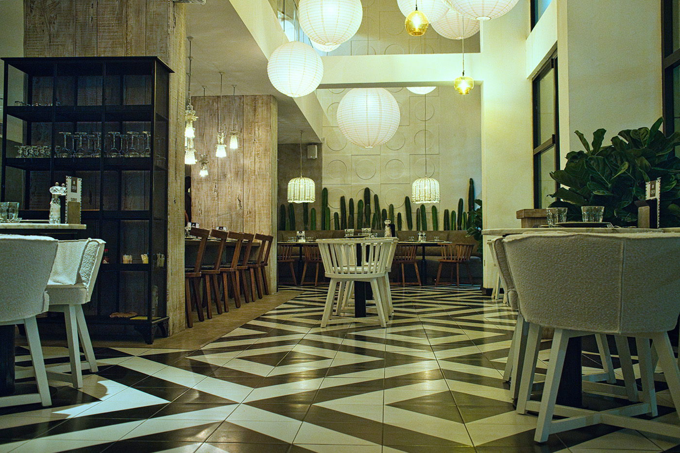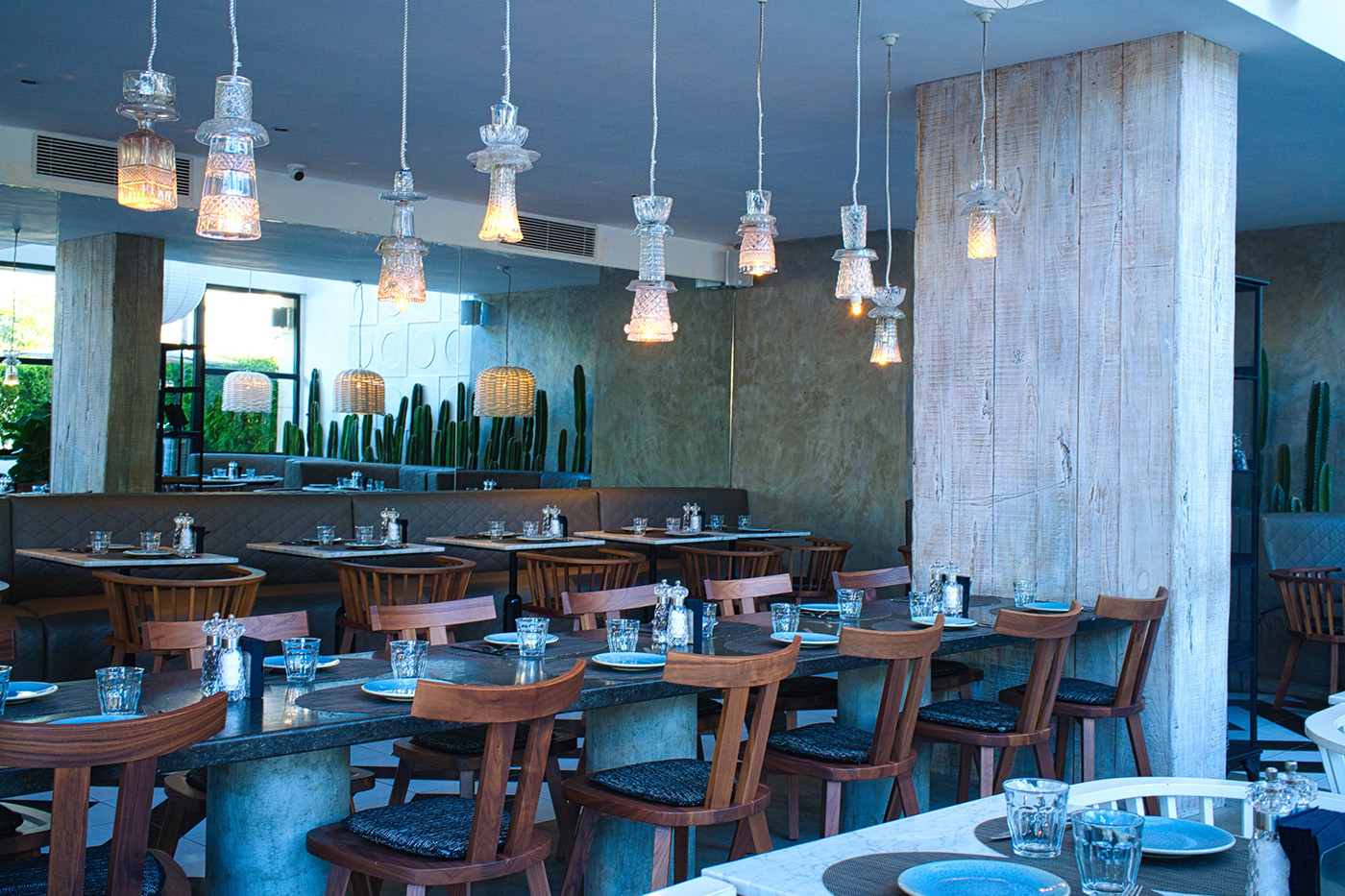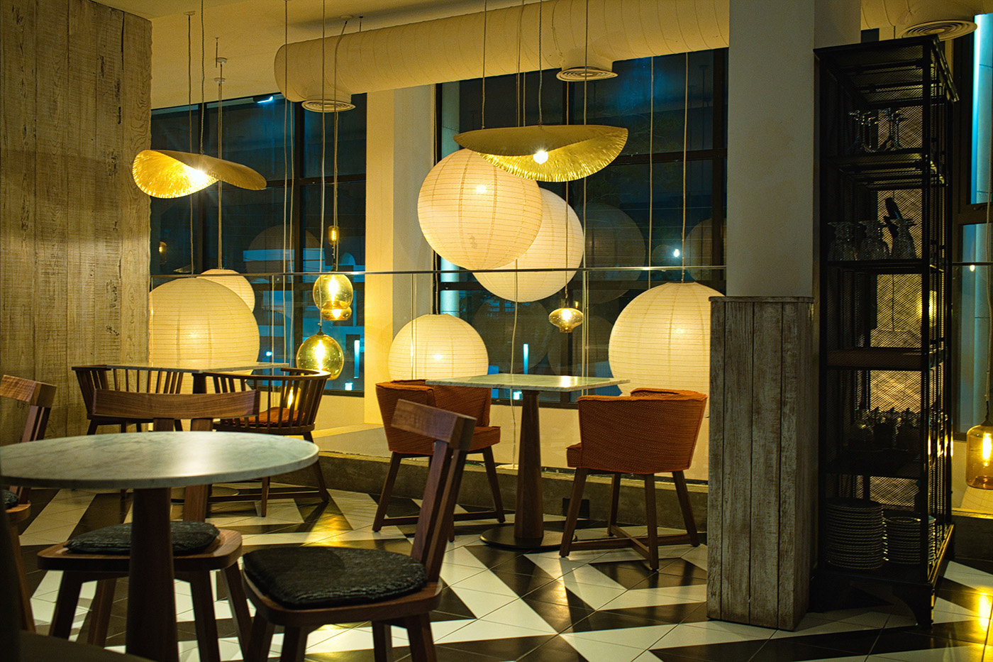 The double height space features dramatic “feather-ball” lighting, specially-commissioned artworks by local sculptors including Ghana’s acclaimed Nana Anoff, a wood-fired pizza-oven in a real, converted food-truck, relaxed bar-top dining options and an uber-stylish, circular private dining space.